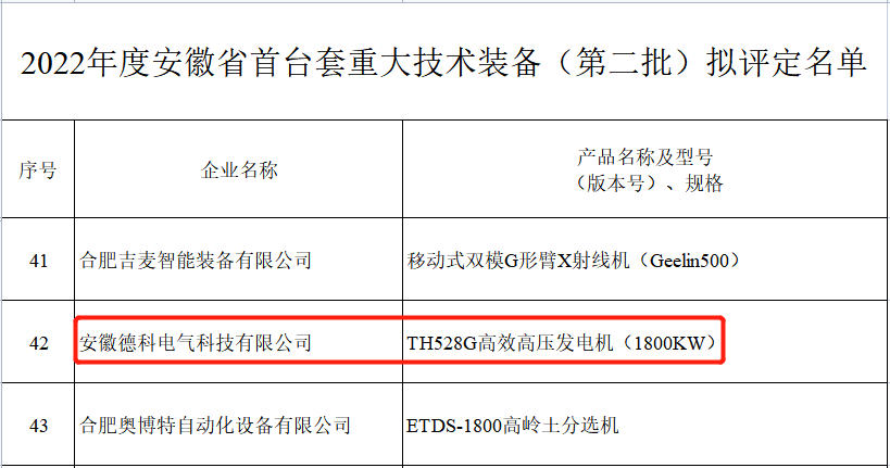 為鼓勵和支持首臺套重大技術裝備的研制和應用,加快我省裝備制造業(yè)轉型升級,推動制造強省建設,根據《安徽省經濟和信息化廳關于印發(fā)<安徽省首臺套重大技術裝備首批次新材料首版次軟件評定管理暫行辦法>的通知》,經企業(yè)申報、所在市經信主管部門審核推薦、第三方評定機構組織專家評審、公示等程序,評定德科TH528G高壓高效發(fā)電機等116套裝備為2022年安徽省第二批首臺套重大技術裝備。