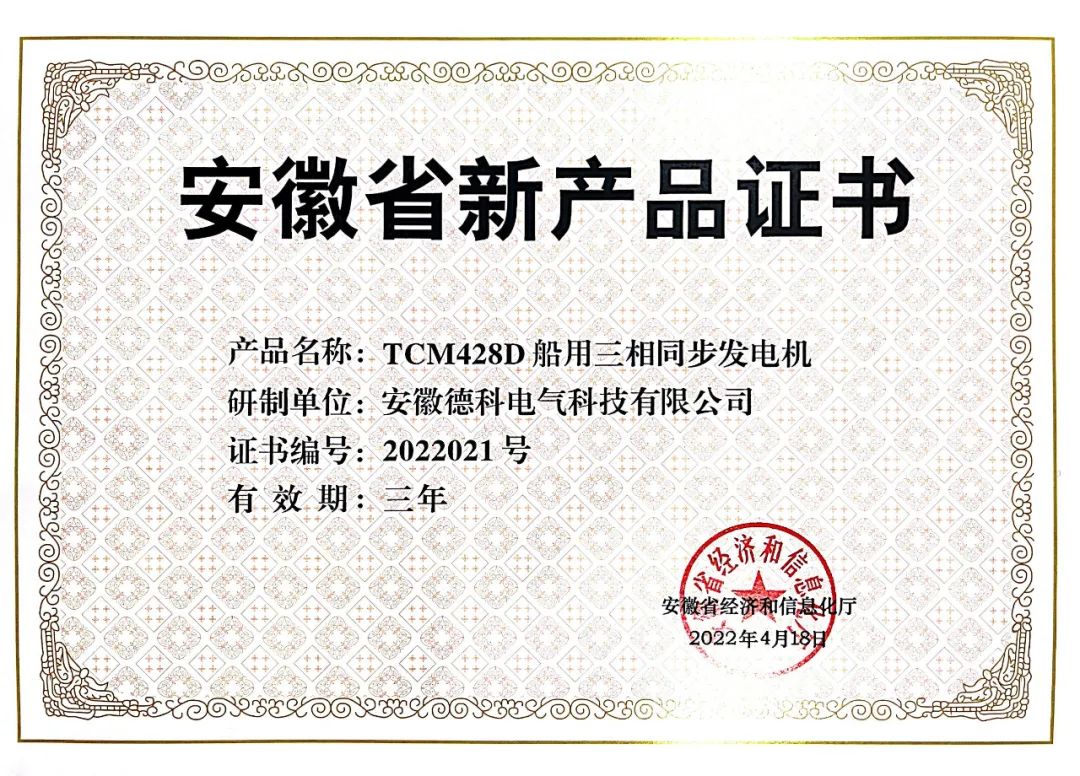 根據《安徽省新產品認定暫行辦法》(皖經信科技函120171880號),安徽省經濟和信息化廳組織開展了2022年第一批安徽省新產品認定工作。經專家評審,認定安徽德科電氣科技有限公司〝TCM428D船用發(fā)電機〞 等113項產品為2022年度安徽省新產品。